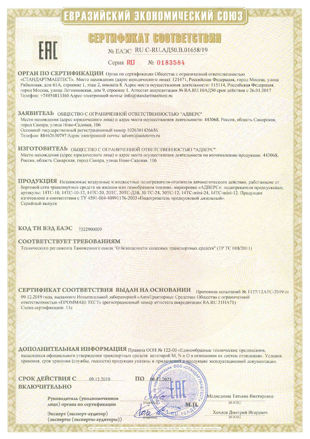 ТЕПЛОСТАР 14ТС — это новые модели предпусковых автономных жидкостных подогревателей, с мощностью 12—20 кВТ, предназначенные для автобусов и грузовых автомобилей, которые работают на дизтопливе либо же на сжатом природном газе. Такие подогреватели обеспечивают прогрев двигателя автотранспортного средства и салона в холодное время года.
