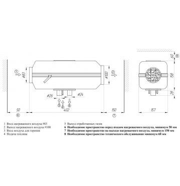 Отопитель требует подключения к сети постоянного тока 24В. Забор топлива производится по топливопроводу, который может заводиться в штатный бак с помощью топливозаборника, или же в отдельный бак.